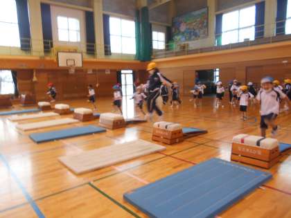 今週から、体育は「とびばこあそび」を始めました。まずは、走って跳び箱の上でジャンプする「ふみこしとび」をしました。高く跳んだり、強く踏み込んだり、ぴたっと着地したりと、楽しみながら何度も練習しました。