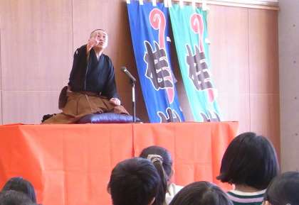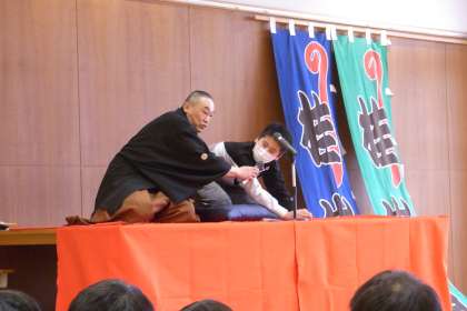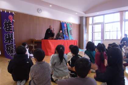 富山市出身の落語家 桂 米福さんをお招きし、落語体験教室を行いました。各学年の代表の子供たちが実際に高座に上がり、視線や表情、声色に気を付けながら小話を体験しました。その後、米福さんの楽しい落語を聞き、プレイルームに子供たちの大きな笑い声が響きました。全校児童にとって、本物に触れる貴重な体験となりました。