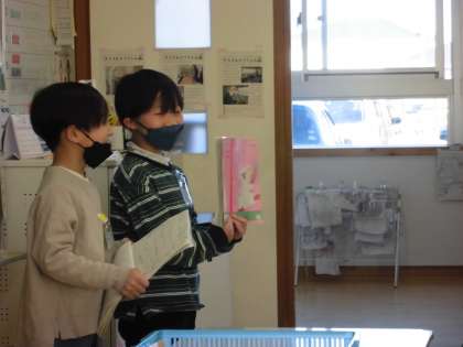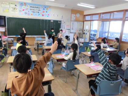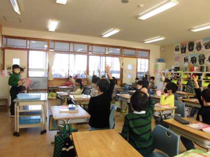 国語で二人一組で学校にあるものから問題を考えて、みんなで出し合って楽しみました。ヒントを聞いたり、分からないことを質問したりして答えを見付けました。「それは、どんなときに使いますか」「それは、どこにありますか」など答えにつながる質問がたくさんありました。