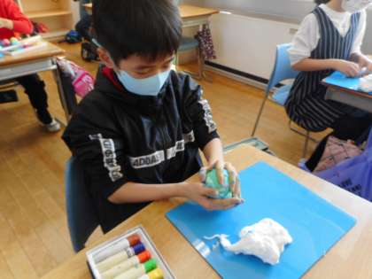 図画工作科では、紙粘土を使って、元気がでる色や形になるように工夫しながらお守りをつくりました。好きな色の粘土にしたり、色を混ぜてマーブル模様にしたりと素敵な作品が出来上がりました。