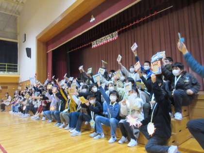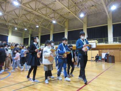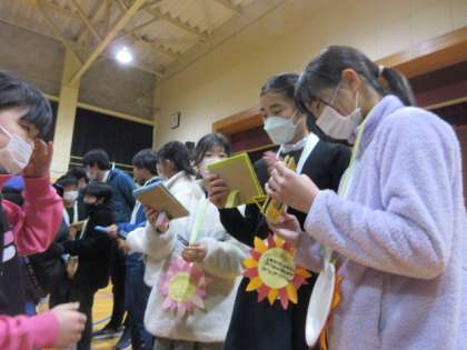 3年生からは、手作り写真立てのプレゼントです。1つ1つ思いを込めて作った写真立てを受け取り、大喜びな6年生でした。