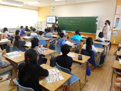 外国語の学習がスタートしました。新しい先生と一緒に、「Hello!」や「Hi!」の練習をしたり、世界の国々の「こんにちは」を言ったりしました。