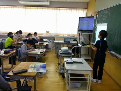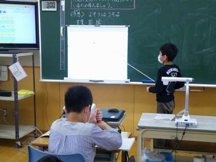 理科では、天気の変化には何が関係しているのかを予想しました。「よそうはうそよ」の合言葉で、自由に予想をして考えをノートにまとめました。また、それぞれの考えを実物投影機でモニターに映し出し、クラスのみんなと共有して考えを深めました。