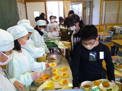給食当番、台拭き、配膳、準備・片付けというように学級を4つのグループに分けて一週間交代で行っています。素早くスムーズに準備して給食が食べられるように、それぞれが声を掛け合って活動しています。