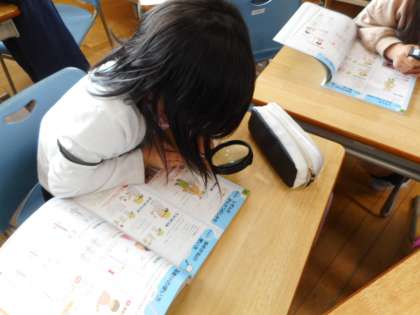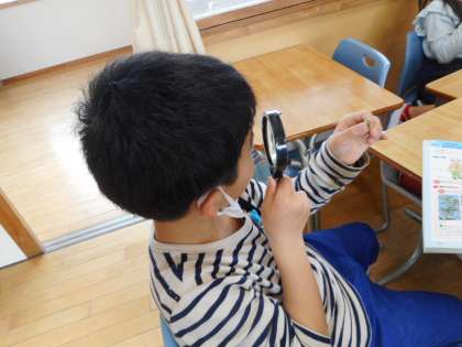 新しく理科の学習がスタートしました。虫めがねの使い方を学び、さまざまな物を虫めがねで見てみました。