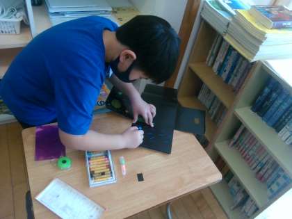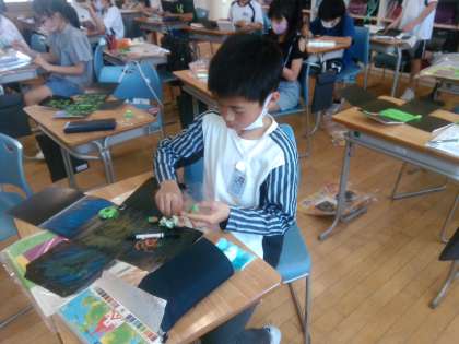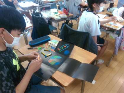 5年生の図工で「のぞいてみると」の学習を行っています。クレヨンや色紙などを用いて、箱の中に自分だけの特別な世界を表現できるよう、熱心に取り組んでいます。