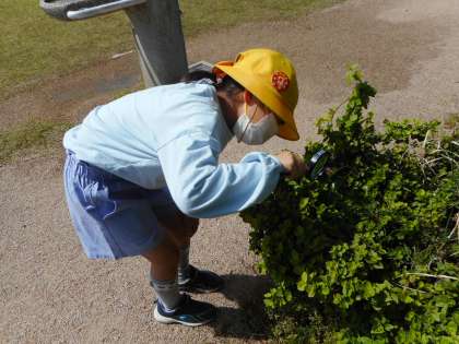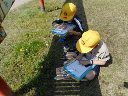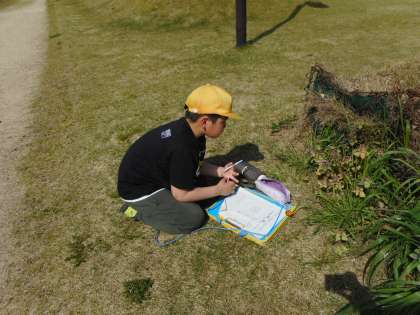理科の学習で、春の生き物を観察しに夢の森公園に行きました。タンポポやヒメオドリコソウ等を虫眼鏡で観察してみると、色の違いを見つけたり、縞模様があることに気付いたりしました。