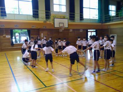 クラス対抗の輪くぐりに挑戦しました。仲間と息を合わせて様々な運動に取り組み、仲間を気遣ったり、力を合わせたりする活動をしています。