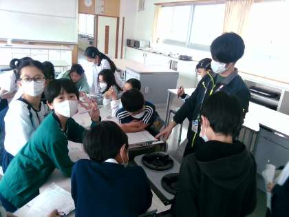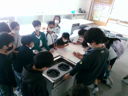 家庭科室にどんな備品があるのか、どのように使うのか調べて体験しました。ガスコンロの使い方や注意点をしっかりと聞き、安全に学習を進められるようにしています。