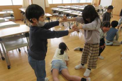 音楽科「BINGO」では、下がっているアルファベットの部分は歌わずに手拍子をしました。色々なバージョンで楽しく歌いました。また「ロンドンばし」では、橋が落ちるドキドキを楽しみながら歌いました。