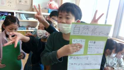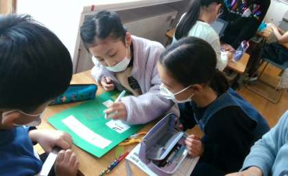 係活動の内容を紹介するカード作りをしました。係名、メンバー、仕事内容を画用紙に書き表し、それぞれの係で工夫してカードを作りました。