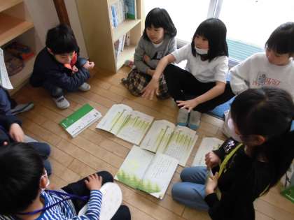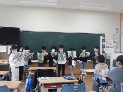 国語科では「ふきのとう」を学習し、音読劇に向けて、班ごとに音読の練習をしています。ふきのとうや雪など、登場人物になりきって音読をしています。