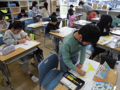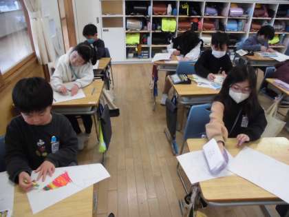 図画工作科では「ふしぎなたまご」を学習しています。ふしぎなたまごは、どんな色かな? どんな形かな? どんな模様かな? たまごが割れると何がうまれるかな? など、想像を膨らませながら描きました。