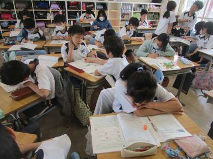 変化が見やすい折れ線グラフの学習を進めています。本時の学習では、折れ線グラフから読み取れることを友だちと見付けて交流しました。様々な意見を聞き、考えを深めている子供たちがたくさんいました。