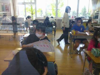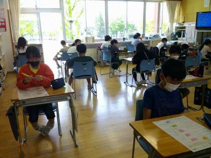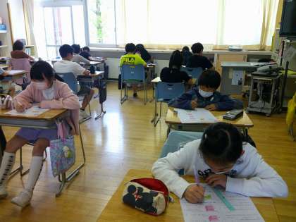 単元の終わりに、テストを行いました。これまでに学習した体積の求め方が身に付いているか確認します。どの子も真剣に取り組む姿が見られました。