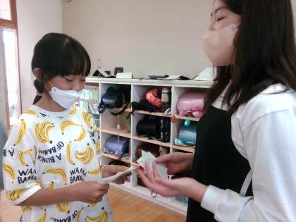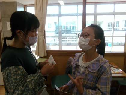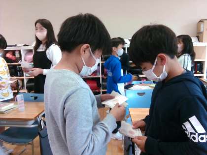 外国語の学習で、名前のつづりや自分の好きなもの・ことを聞き合う活動をしています。今日は、友達と楽しんでコミュニケーションをとりながら、つくった名刺交換しました。