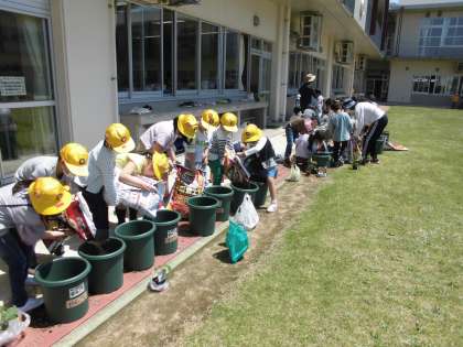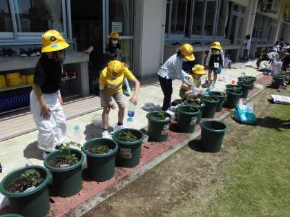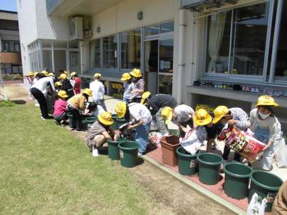 今日は、自分が植えたい野菜の苗を植えました。友達と協力して土を入れたり、水をあげたり、一生懸命に取り組みました。おいしい野菜を育てようと張り切っている子供たちです。