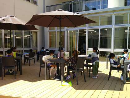 図書室で本を借りました。今日はとてもいい天気だったので、図書室横のぽかぽかにじいろテラスで読書をする1年生の姿もありました。