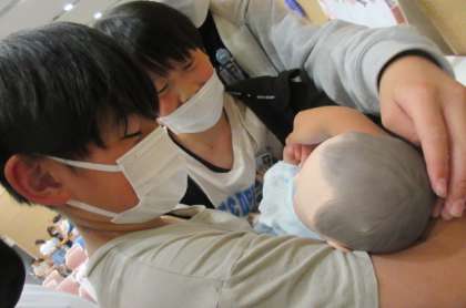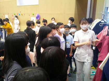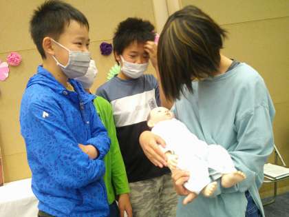 看護体験をさせていただきました。赤ちゃんの模型を抱っこしたり、看護師さんのユニフォームを見学したりしました。