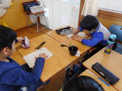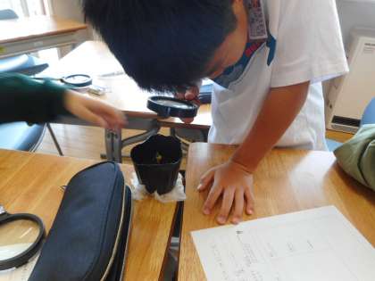 いくつかの植物から芽が出てきたので、観察をしました。植物によって、育つ速さや色、茎の太さなどの違いをたくさん見つけたり、虫眼鏡でよく観察して細かい毛があることに気付いたりしました。