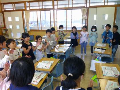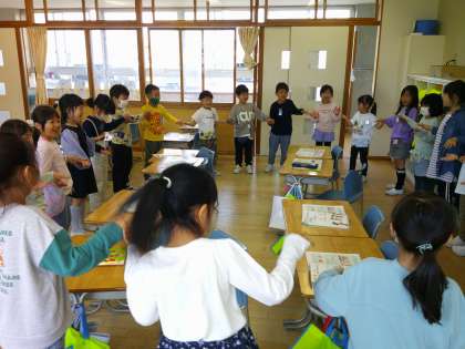 「たん たん たん うん」のリズムで、なまえあそびとフルーツランドというリズム遊びをしました。名前を呼ばれて返事をしたり、「うん」のタイミングで隣の友達と手を叩いたりするたびに、笑顔になっていました。