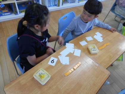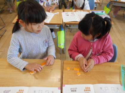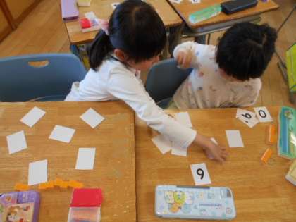 算数科では、ブロックや数カード等を使って理解を深めています。友達と仲良く学習しています。