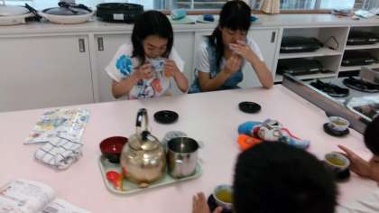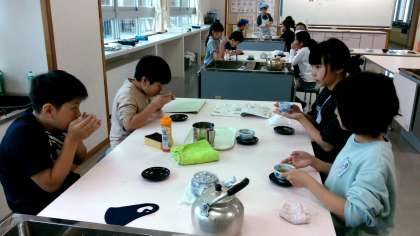 茶葉を使って、急須でお茶を入れました。お茶の温度やこさが均等になるように、入れ方を工夫して協力して取り組みました。