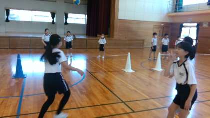 プレルボールの簡易なゲームを楽しみました。3人組になって、ボールをバウンドさせてつなぎます。力を合わせて相手のコートに返しました。
