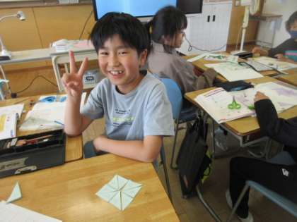 算数の学習では、色紙にコピーした複数の三角定規を回転させながら並べて、きれいな風車の形ができることを楽しみました。風車の形に並べることを通して、子供たちは、どの角を使っても、半回転や1回転できることを学びました。
