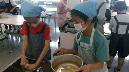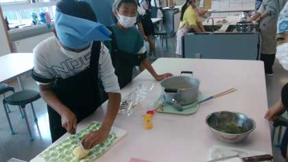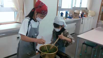 今日は2組が調理実習でした。ほうれんそうのおひたしとゆでいもを作ります。
