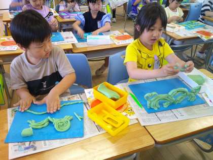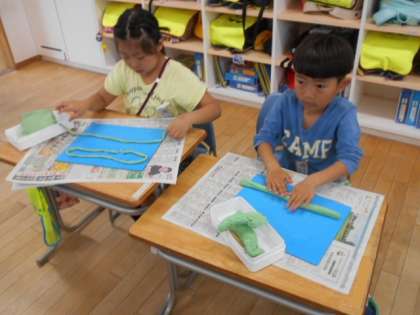 図工の時間に粘土をしました。ひも状にした粘土を使って、自分だけの作品を作ることを楽しみました。