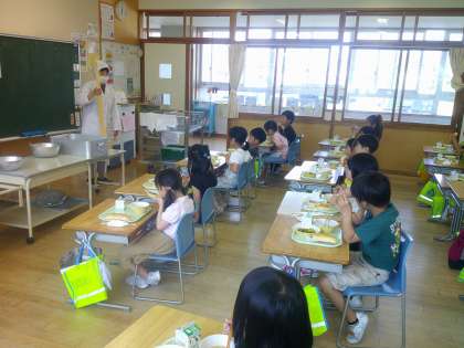 給食の時間、栄養士さんの話を聞きました。多くの人数分の給食を作るための大きな道具を見せてもらいました。給食を時間をかけて、一生懸命作っているという話を聞いて、残さずに食べキリンしたいという気持ちをもつことができました。