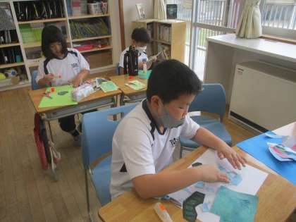 図画工作科「絵の具でゆめもよう」の学習では、様々な材料で描いた絵を自由に切ったり貼り合わせたりし、いろいろな世界を表現しました。友達と模様を交換して作品のイメージを広げながら活動していました。