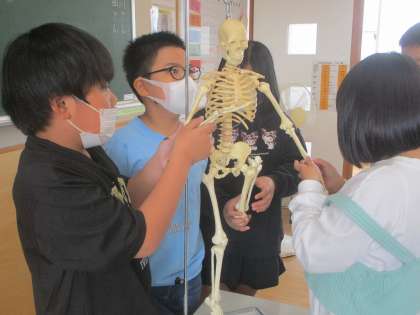 腕がどのようにして動くのか学習した子供たちは、ほかの体の部位がどのようになっているのかに興味をもち、調べ学習に進んで取り組みました。骨の模型を見ながら「首には細かい骨がたくさんあるね」と友達と進んで会話をする様子が見られました。