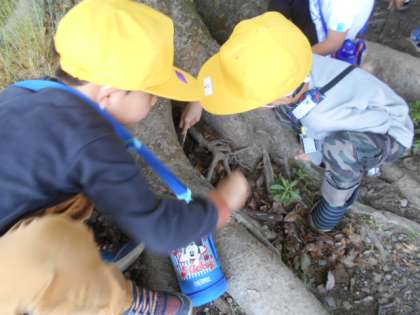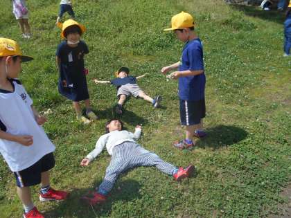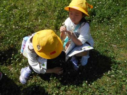 生活科の学習で、外に出て、生き物やシロツメクサ等を探して遊びました。シロツメクサをたくさん摘んで、花冠や指輪を作ったり、草の上に寝転んでその感触を楽しんだりしました。
