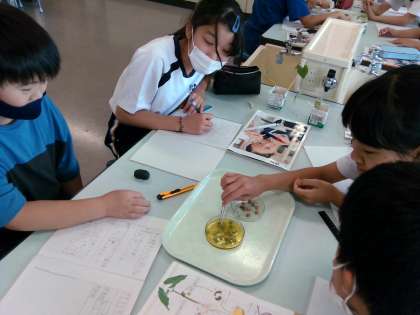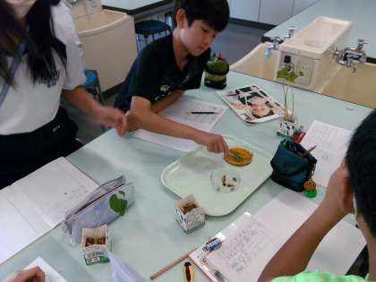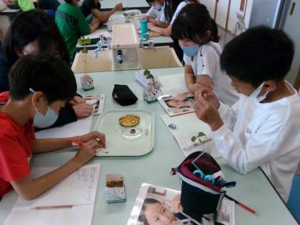発芽した後の子葉がしおれていることから、子葉の中には養分があるのではないかと予想を立てて、実験を行いました。実験を通して、発芽前の種子と発芽後の子葉の違いに気づき、発芽には子葉の中にある養分が使われていることを発見しました。