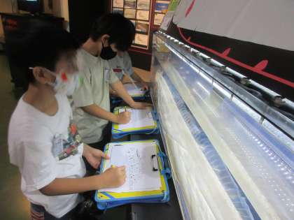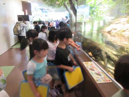 水族館での活動の様子です。生き物を観察したりクイズを解いたり、お気に入りの生き物をスケッチしたりしました。