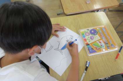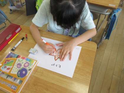 今日は、昨日の遠足を思い出しながら色を塗りました。