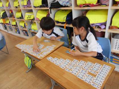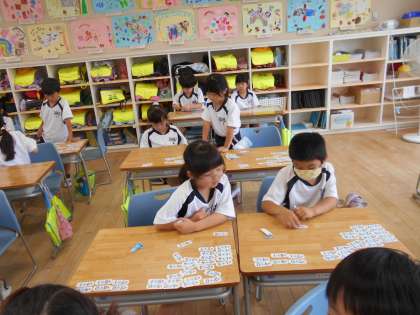 たし算カードでの学習を始めました。たくさんのカードに、子供たちはびっくり!たし算の練習をがんばるぞと、意欲いっぱいの子供たちでした。
