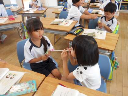 今日は、はちどりのくちばしを学習しました。「細くて長いはちどりのくちばしは、ストローみたいだね」と、はちどりになったように、お花のみつを吸うまねをしてみました。いろいろなくちばしがあることを実感していました。
