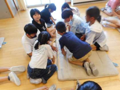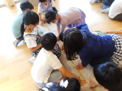 算数の学習で、1mより長いマットの長さを測りました。ものさしをつなげて測るのは難しいことに気付き、まきじゃくのよさを感じていました。まきじゃくの0を確かめて、マットの長さを協力して測りました。