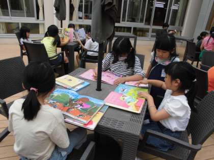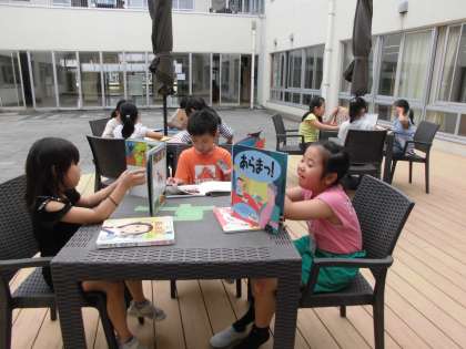 読書が大好きな2年生。今日は晴れていたのでテラスで読書をしました。