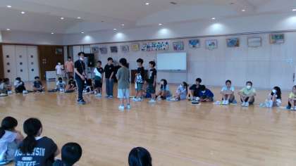 宿泊学習で行う予定のキャンプファイヤーのリハーサルを行っています。係の児童を中心にプログラムを進行していきます。