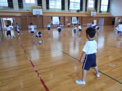 体育科の時間に、ボールを転がしたり受けたりしました。また、チームを決めて転がしドッジボールをして楽しみました。