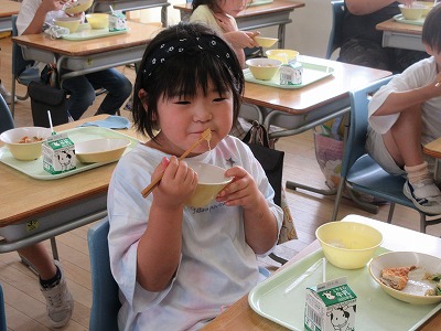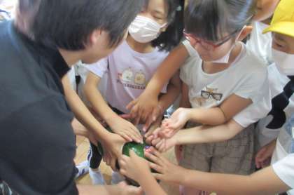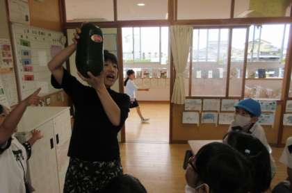 今日の給食に冬瓜が出ました。調理の前に、栄養教諭の先生が冬瓜を見せてくださいました。今、自分でそれぞれの野菜を育てている子供たちは、「太いきゅうりみたい」「スイカに似ている」「どんな味がするのだろう」と楽しみにしていました。給食の時間には、冬瓜の煮物をおいしくいただきました。