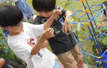 アサガオが生長してきました。つるが長く伸び、花も咲き始めました。子供たちは、きれいな花がたくさん咲くことを楽しみにしています。