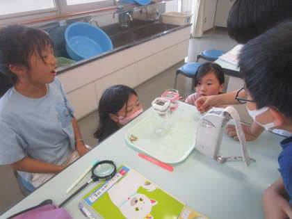 グラウンドの砂と砂場の砂の量をはかって、水のしみこみ方を比べました。グループで協力して、2種類の砂の違いを見付けていました。