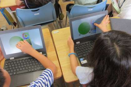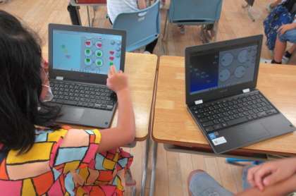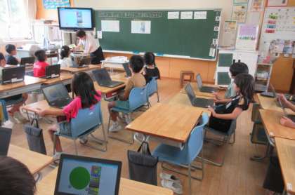 この日は、ビスケットというアプリを使いました。プログラミングをして、自分で描いた絵を動かしました。子供たちは、教頭の指導のもと、操作の仕方を真剣に聞いて楽しみながら活動していました。自分の描いた絵が動くと「おぉ〜!」と歓声があがっていました。