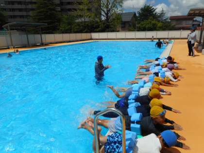 水泳教室2日目でした。それぞれのチームでバタ足や息継ぎ、クロールの練習をしました。