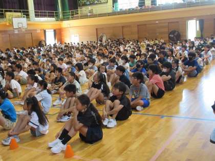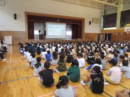 1学期の終業式が行われました。校長先生の話では、「つたえる・つながる・おもしろい」の観点から、1学期の活動の様子を写真で紹介され、子供たちは1学期のがんばりを確認しながら振り返っていました。